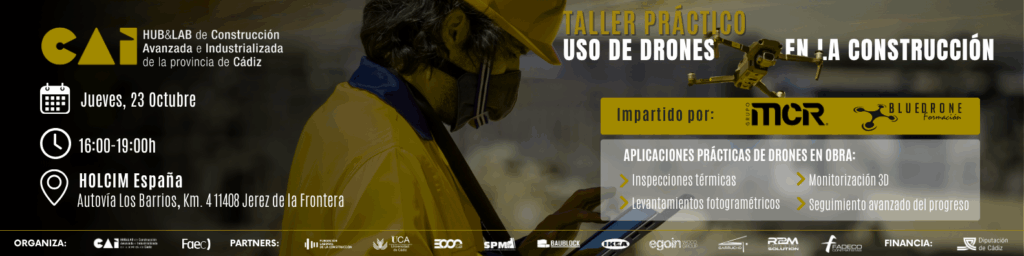 El próximo jueves, 23 de octubre, el Hub&Lab de Construcción Avanzada e Industrializada de la provincia de Cádiz, impulsado por FAEC Cádiz, celebrará un taller práctico sobre el uso de drones en la construcción, en colaboración con Grupo MCR y Bluedrone Formación.